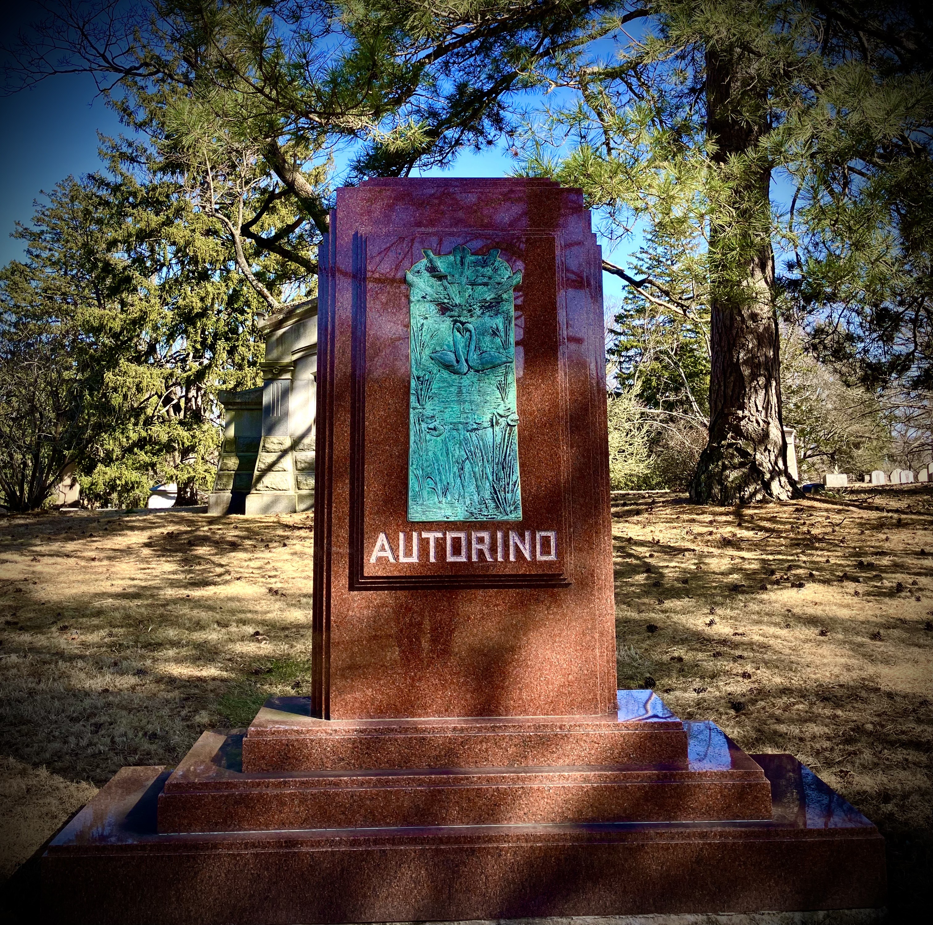 Leone Family memorial in Cedar Hill Cemetery, Salisbury Pink Granite.Overstrom Family memorial in Cedar Hill Cemetery, Hartford, Connecticut. Installed in 2007, the base is 7′ x 7′ and overall height is 14′. All hand-axed Impala Granite.Suffield War Memorial in Suffield, Connecticut designed by John T. Zito Jr.; produced and installed by others.The Founders of Hartford monument in Stony Creek Granite from Branford, Connecticut replaced a failing 1837 Portland Brownstone version in exact dimensions. It was commissioned by The Society of the Descendants of the Founders of Hartford in 1986 to commemorate Hartford’s 350th anniversary and installed in the exact original location in the Gold Street Ancient Burying Ground, Hartford, Connecticut. The top of the shaft was hollowed out to hold a time capsule for future opening.Autorino Family memorial in Cedar Hill Cemetery, Wausau Red Granite and custom bronze inlay.Frederick Law Olmsted bronze bust — this famous landscape designer was from Hartford. He designed New York’s Central Park, Elizabeth Park in West Hartford, The Institute of Living in Hartford & dozens of notable parks nationwide. This bronze casting is installed on the grounds of The Institute of Living in Hartford. It is mounted on a Mountain Rose Granite base.